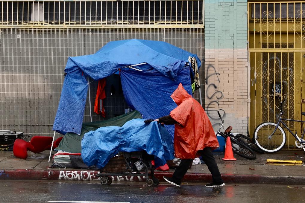 2023年1月10日,一名无家可归者冒雨走在美国洛杉矶市中心第六街街头。新华社发