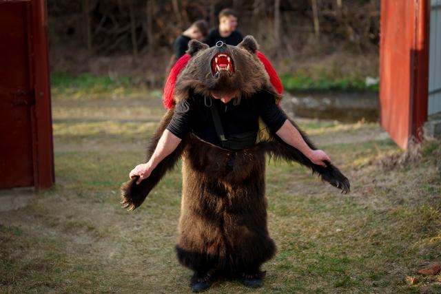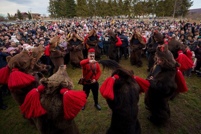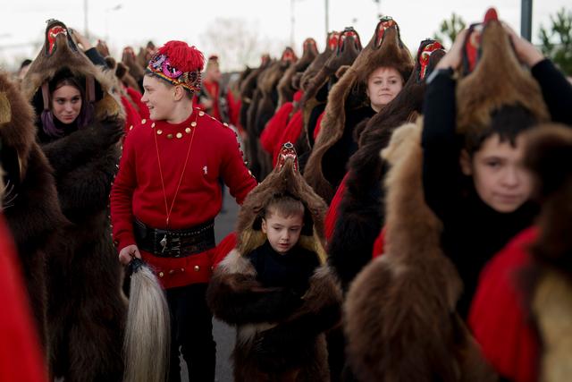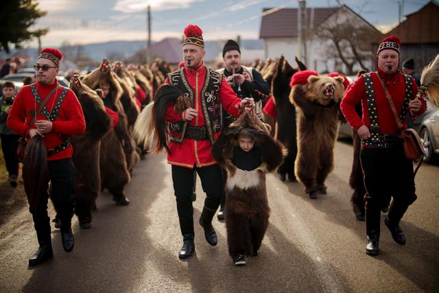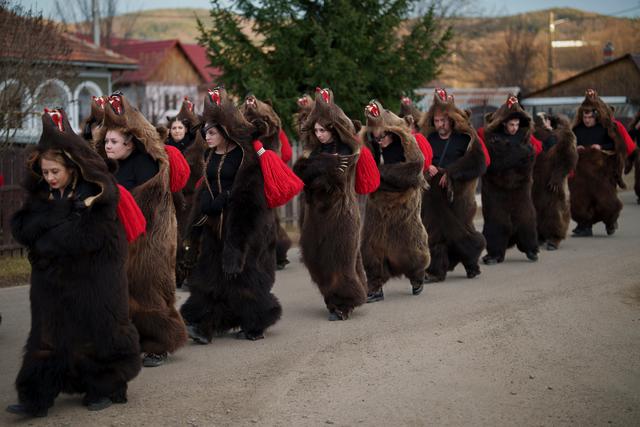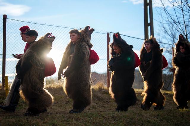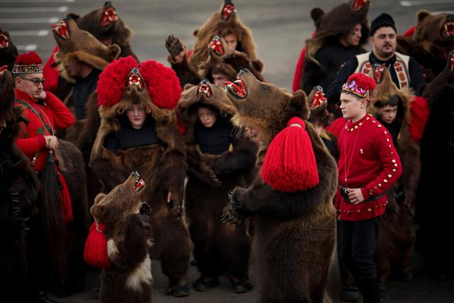 “熊舞”是罗马尼亚的迎接新年的传统仪式,表演者们会穿上色彩斑斓的服饰或披上“熊衣”挨家挨户唱歌跳舞,希望借此趋吉避凶。