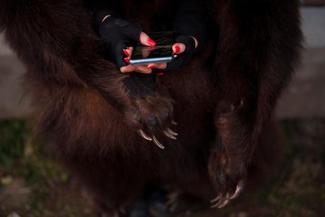 12月26日,在罗马尼亚北部科默内什蒂附近,一名“熊舞”表演者在表演结束后看手机。新华社/美联