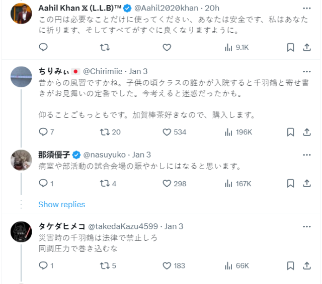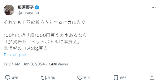 那须优子在帖子里提到,日本不少人花钱购买千纸鹤,随后占用宝贵的运输资源把这些对救灾毫无用处的手工艺品送往灾区。对于这种现象,她表示“花同样的钱,占用同样的重量,我们明明可以向灾区捐赠茶包和食物”。