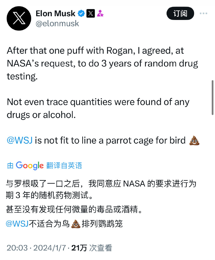 同时,马斯克还表示,(华尔街日报,刊发马斯克吸毒报道的媒体)都不配给鸟当厕纸。