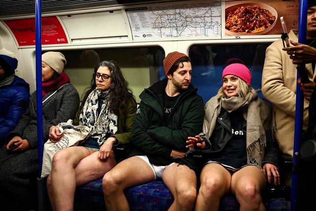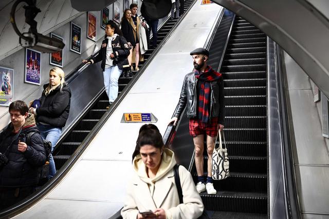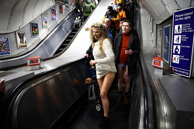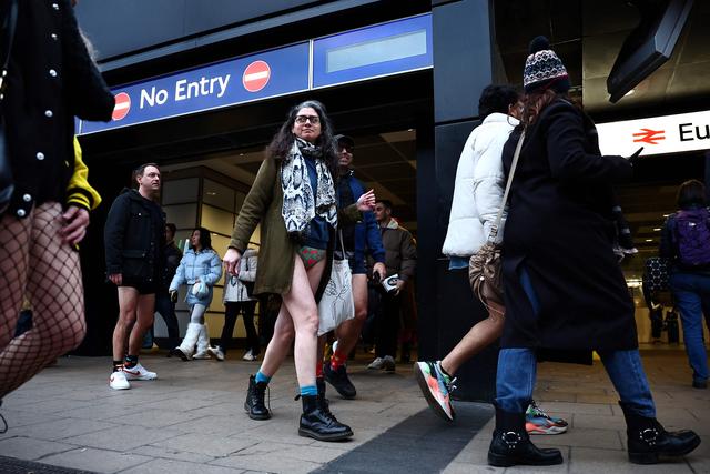 1月7日,人们在英国伦敦参加“不穿裤子搭地铁”活动。新华社/法新