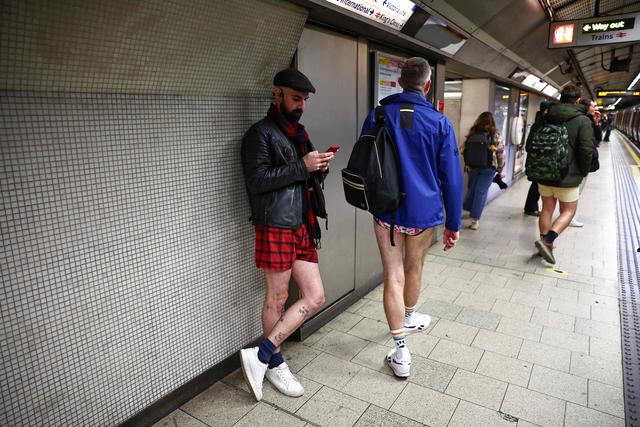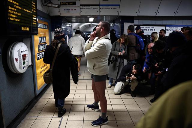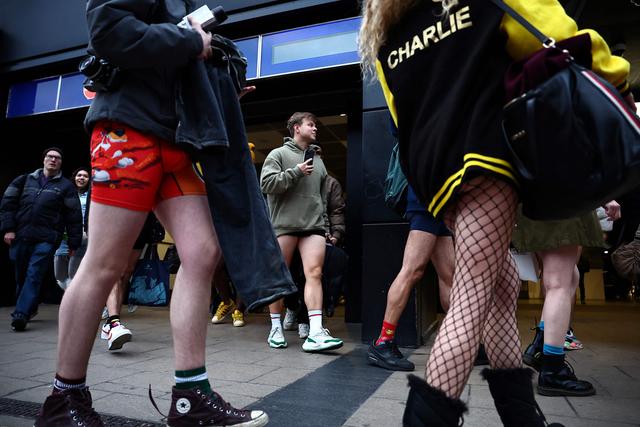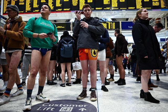 1月7日,参加“不穿裤子搭地铁”活动的人们在英国伦敦一个地铁站候车。新华社/法新