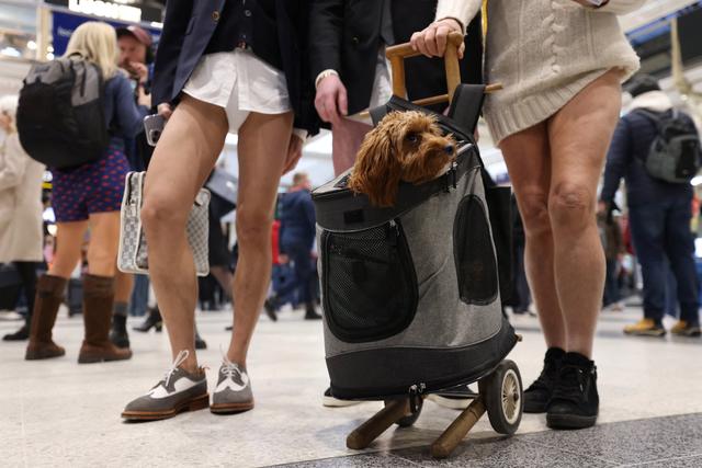 1月7日,参加“不穿裤子搭地铁”活动的人们带着宠物狗来到英国伦敦一个地铁站。新华社/路透