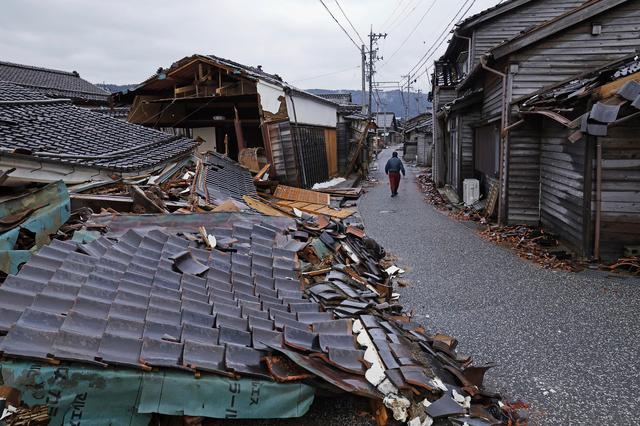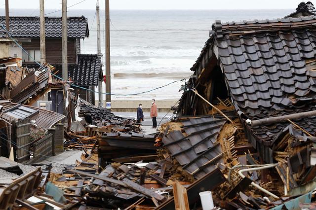 1月10日,在日本石川县轮岛市,行人经过遭地震损毁的建筑。新华社/美联