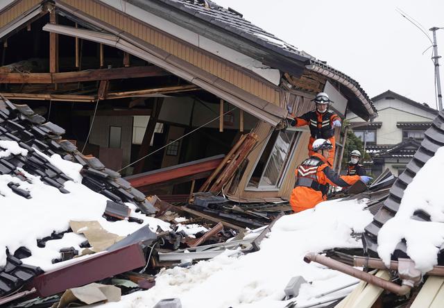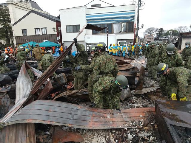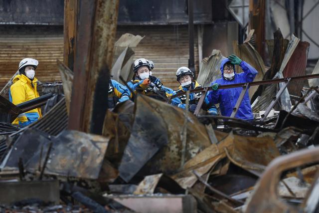 1月10日,在日本石川县轮岛市,自卫队队员在一处市场废墟搜救。新华社/美联