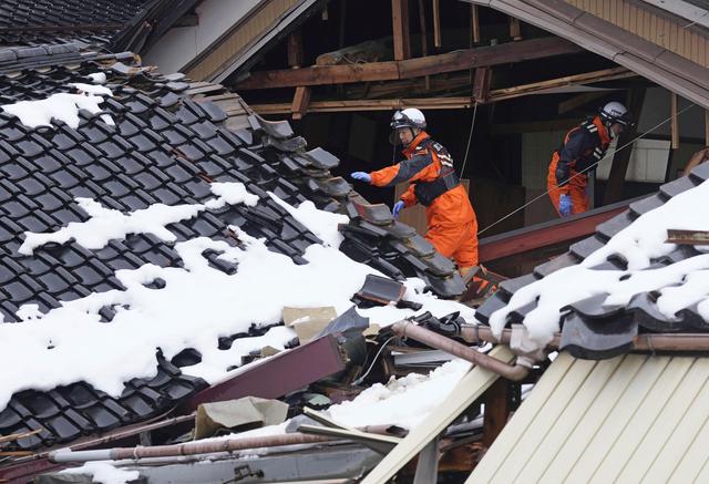 1月10日,消防员在日本石川县珠洲市的地震废墟中搜救。新华社/美联