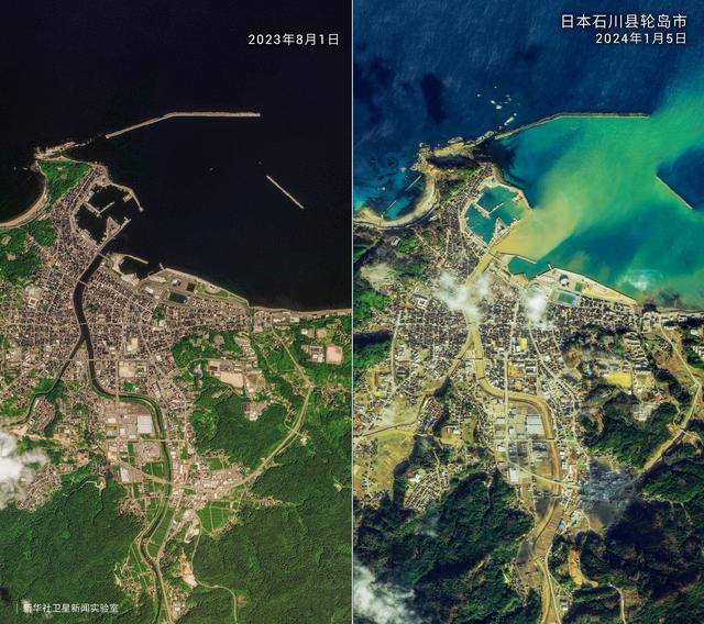 这张拼版照片显示的是2023年8月1日(左)和2024年1月5日日本轮岛市部分海岸线及市区的卫星影像。新华社发(新华社卫星新闻实验室供图)