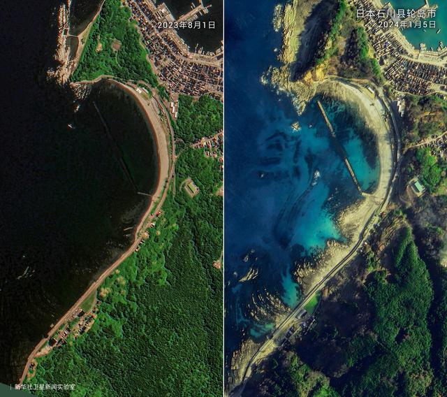 这张拼版照片显示的是2023年8月1日(左)和2024年1月5日日本轮岛市部分海岸线的卫星影像。新华社发(新华社卫星新闻实验室供图)
