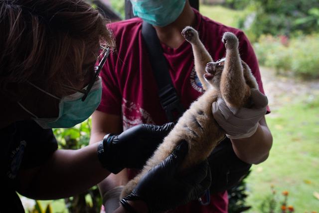 1月19日,在印度尼西亚西爪哇省苏加武眉,国际动物救援组织的工作人员在放归一只爪哇懒猴前对其进行检查。新华社/法新