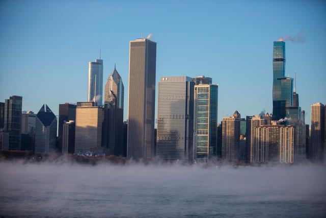 这是1月14日在美国芝加哥拍摄的严寒中的城市景观。新华社发(文森特·约翰逊摄)