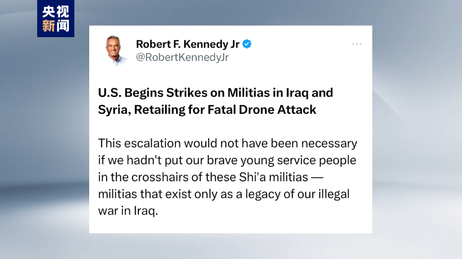 对于美国空袭伊拉克和叙利亚境内目标一事,美国总统参选人小罗伯特·肯尼迪2月2日发文说,美国在中东地区的驻军不受欢迎,也是不必要的。伊拉克和叙利亚政府都曾要求美军撤离,而美国政府则通过制裁和威胁维持着驻军。他认为,美国必须把这些驻扎在中东地区的军队撤出。