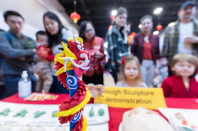 2月10日,在加拿大多伦多,人们在庙会上参观面塑作品。新华社发(邹峥摄)