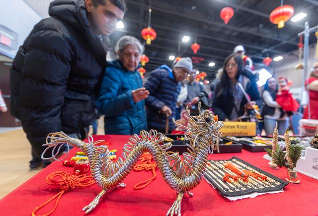 2月10日,在加拿大多伦多,人们在庙会上观看中国传统手工艺品。新华社发(邹峥摄)