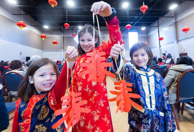 2月10日,在加拿大多伦多,身穿中国传统服饰的儿童在庙会上展示剪纸作品。新华社发(邹峥摄)