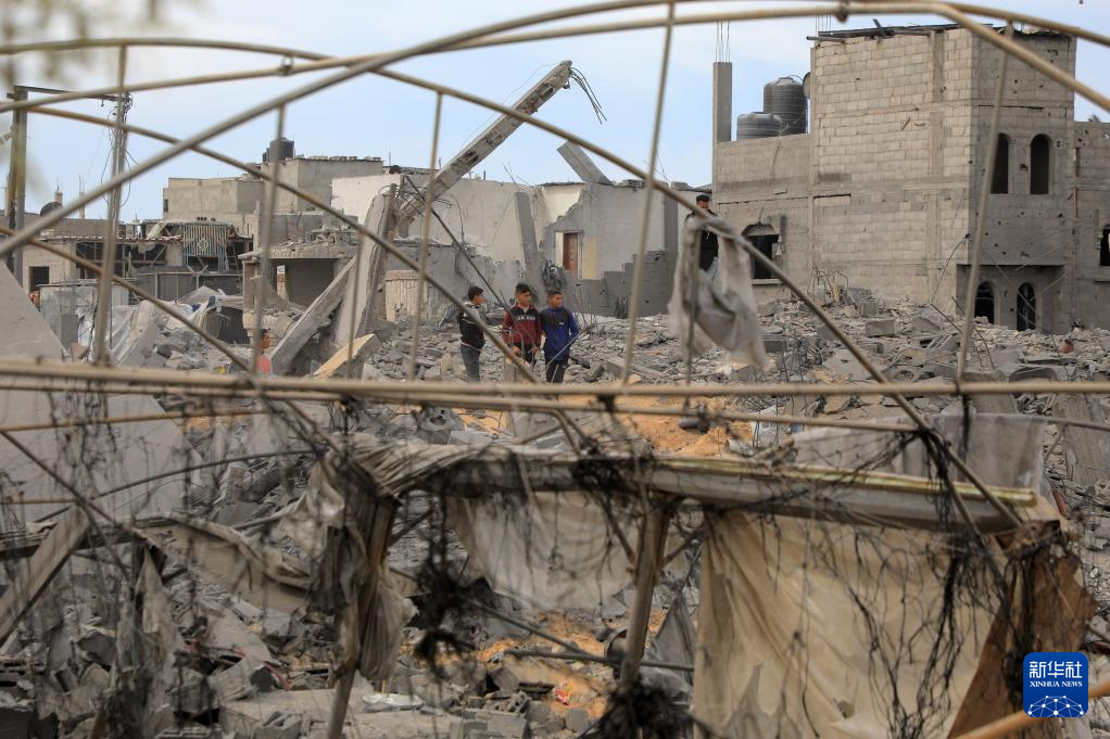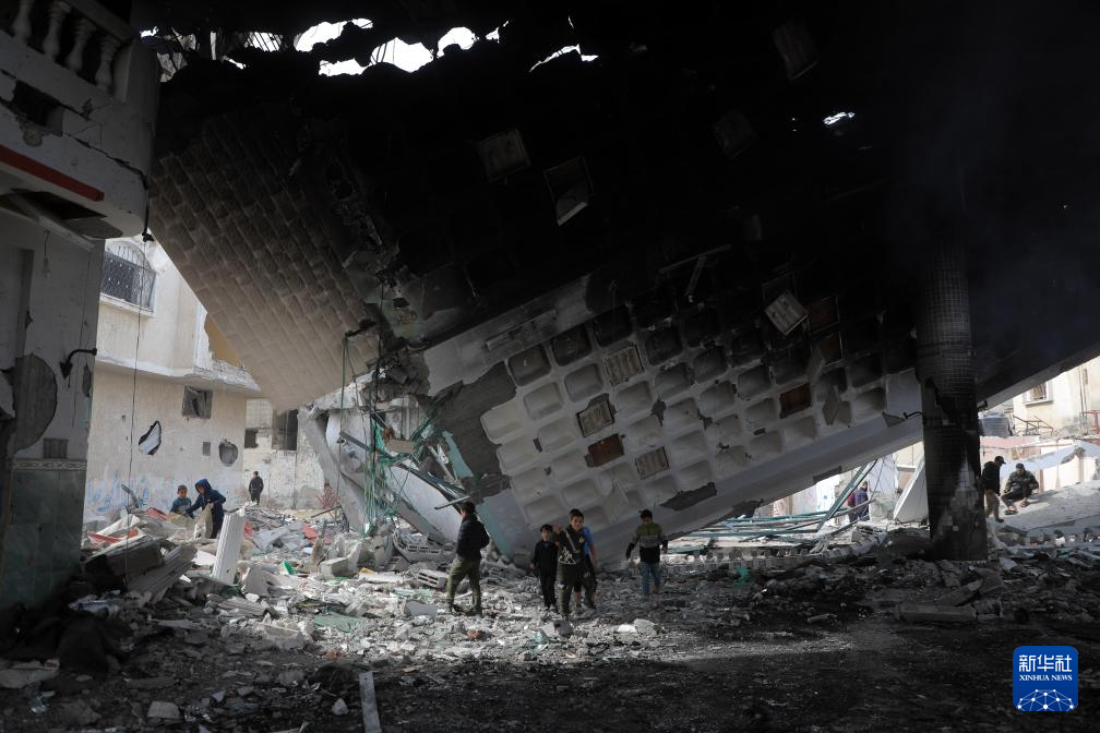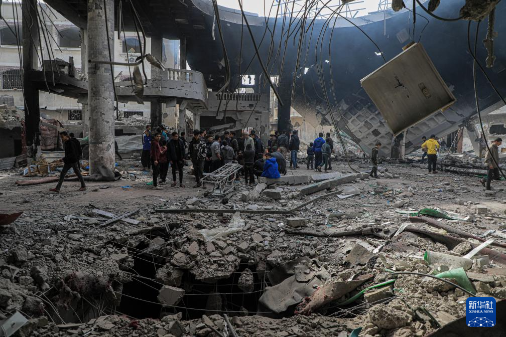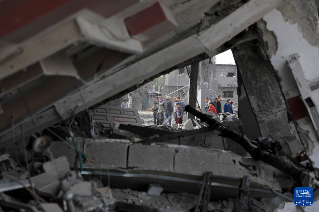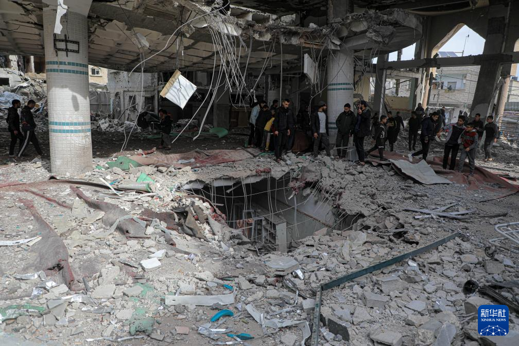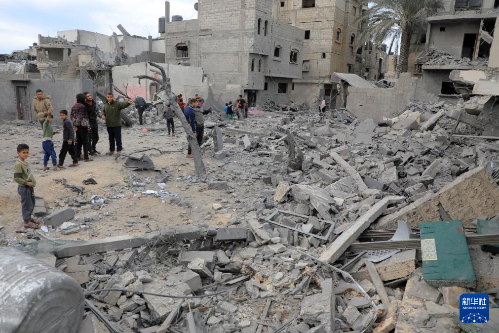 2月12日,人们在加沙地带南部城市拉法查看一处废墟。