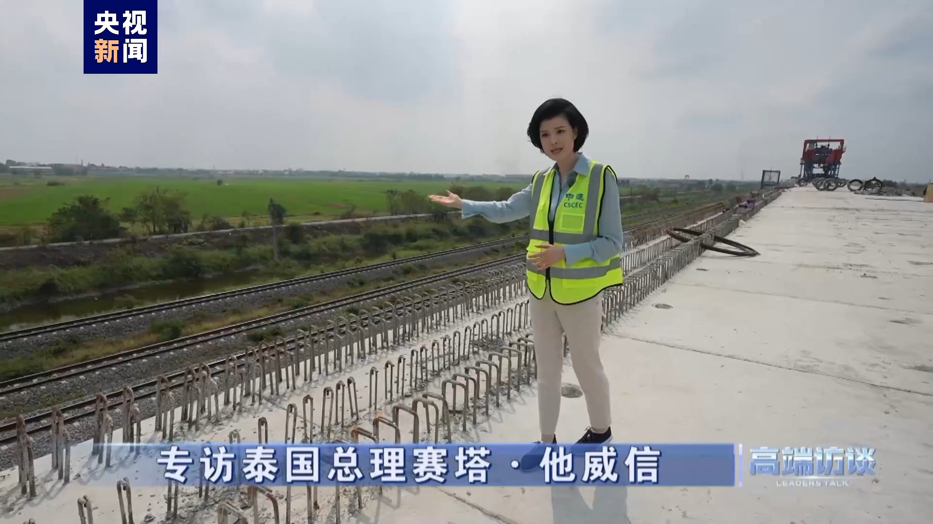 我们可以看到现场的施工现在已经取得了很大的进展。大家如果顺着我的手往那个方向看呢,看到的就是泰国现有的米轨,之所以叫做米轨,是因为它采用的是当地已经延续了一个多世纪的1000毫米的设计标准。但是现在,其中有些路段已经是无法满足现代铁路运输的需求。而正在建设中的中泰高铁采用的是1435毫米的标准轨道,在完工之后有望提升整个泰国的建设和运输能力。