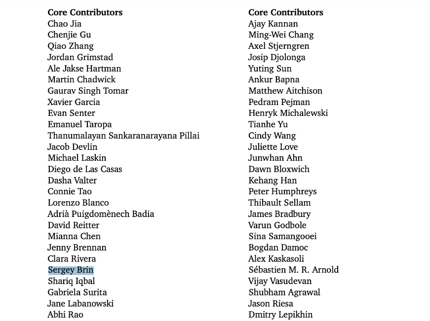 自从聊天机器人ChatGPT的爆火让谷歌内部于2022年12月拉响“红色代码警报”后,被视为谷歌传奇人物的布林便从半退休的状态回归到公司。在Gemini大模型的核心贡献者名单中,也能看到布林的名字。