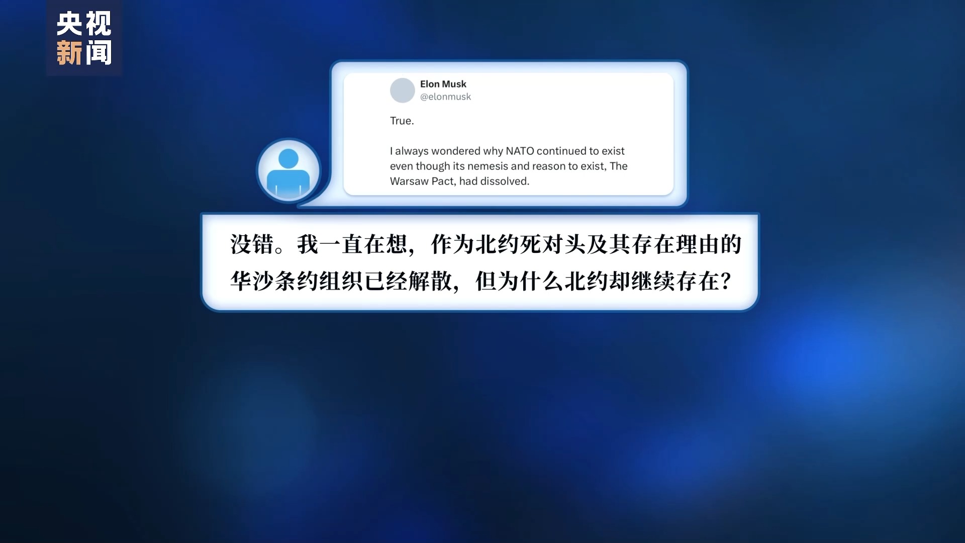马斯克转发了该推文并评论道,“没错。我一直在想,作为北约死对头及其存在理由的华沙条约组织已经解散,但为什么北约却继续存在?”