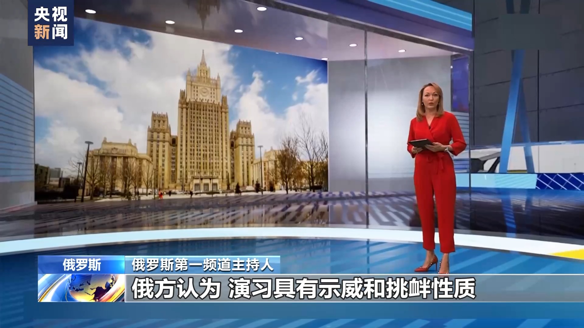 俄罗斯第一频道主持人:俄方认为,演习具有示威和挑衅性质。俄外交部表示,俄军方正密切跟踪局势。