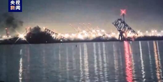 26日,美国马里兰州巴尔的摩“弗朗西斯·斯科特·基”大桥遭船只撞击后坍塌。巴尔的摩消防部门称,桥梁坍塌事件恐造成多达20人及多车落水。(央视记者 刘骁骞)