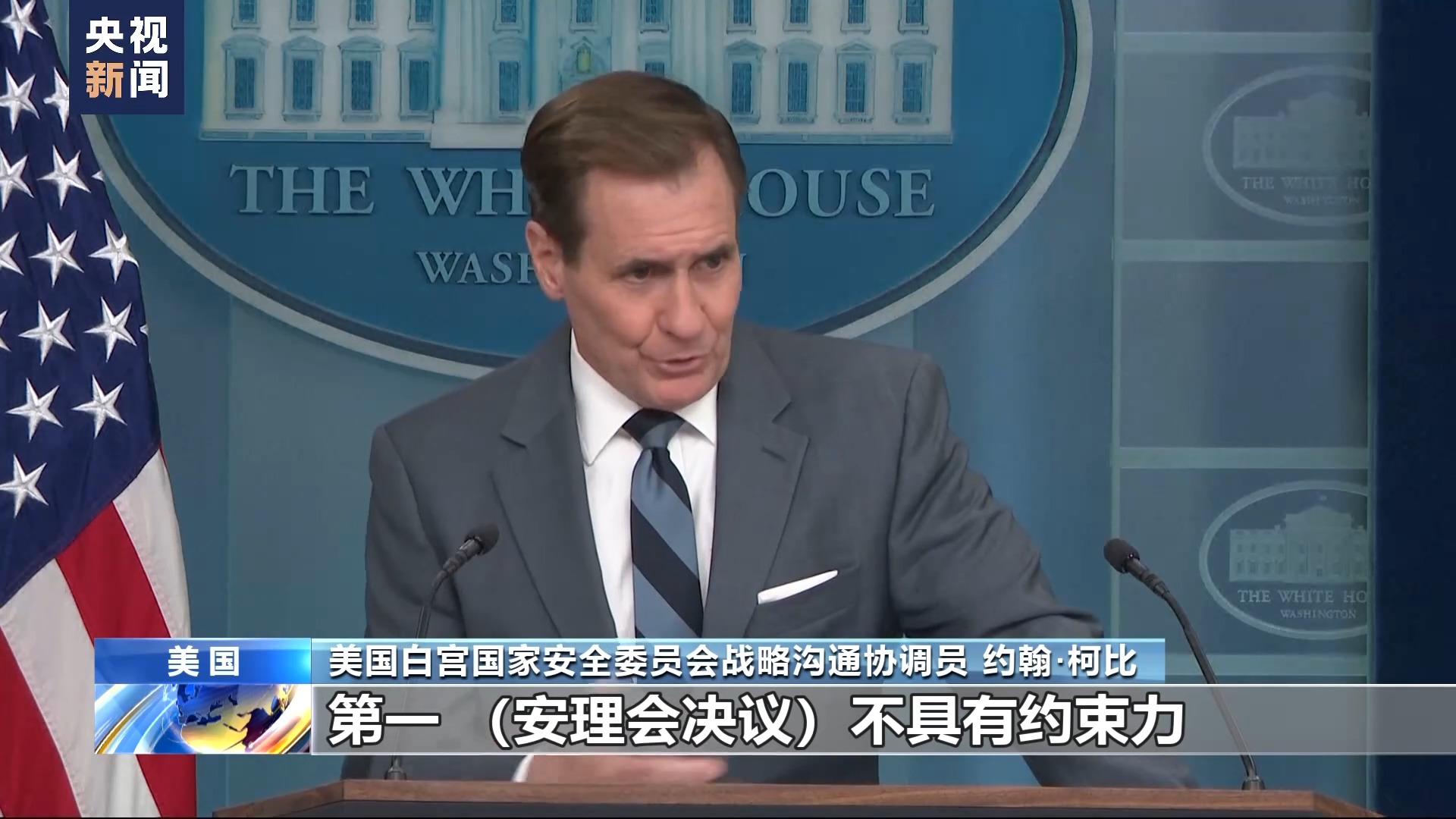 美国白宫国家安全委员会战略沟通协调员 约翰·柯比:在此需要重申,第一,(安理会决议)不具有约束力,因此对以色列完全没有影响,不影响以色列继续与哈马斯作战。第二,正如我刚才所说,这一点也不代表美国政策有所改变。