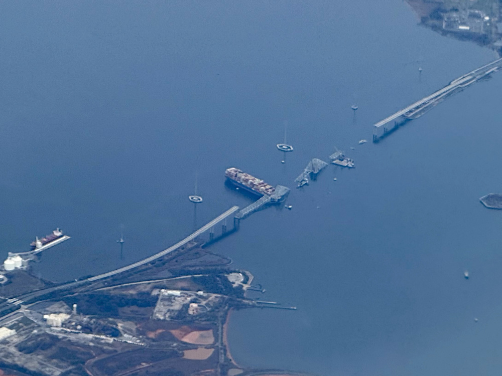 这是3月31日在美国马里兰州巴尔的摩市拍摄的塌桥事故现场(航拍照片)。新华社/法新