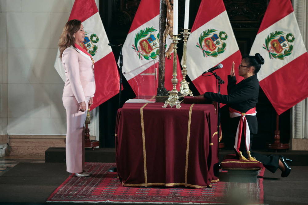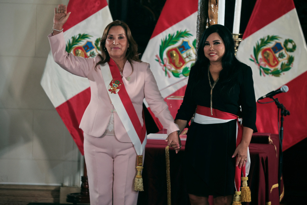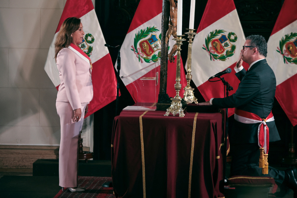 4月1日,在秘鲁利马,秘鲁总统博鲁阿尔特(左)和新任妇女和弱势群体部长出席宣誓就职仪式。新华社/路透