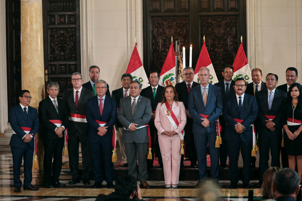 4月1日,在秘鲁利马,秘鲁总统博鲁阿尔特(右二)在内阁部长宣誓就职仪式后与部长们合影。新华社/路透