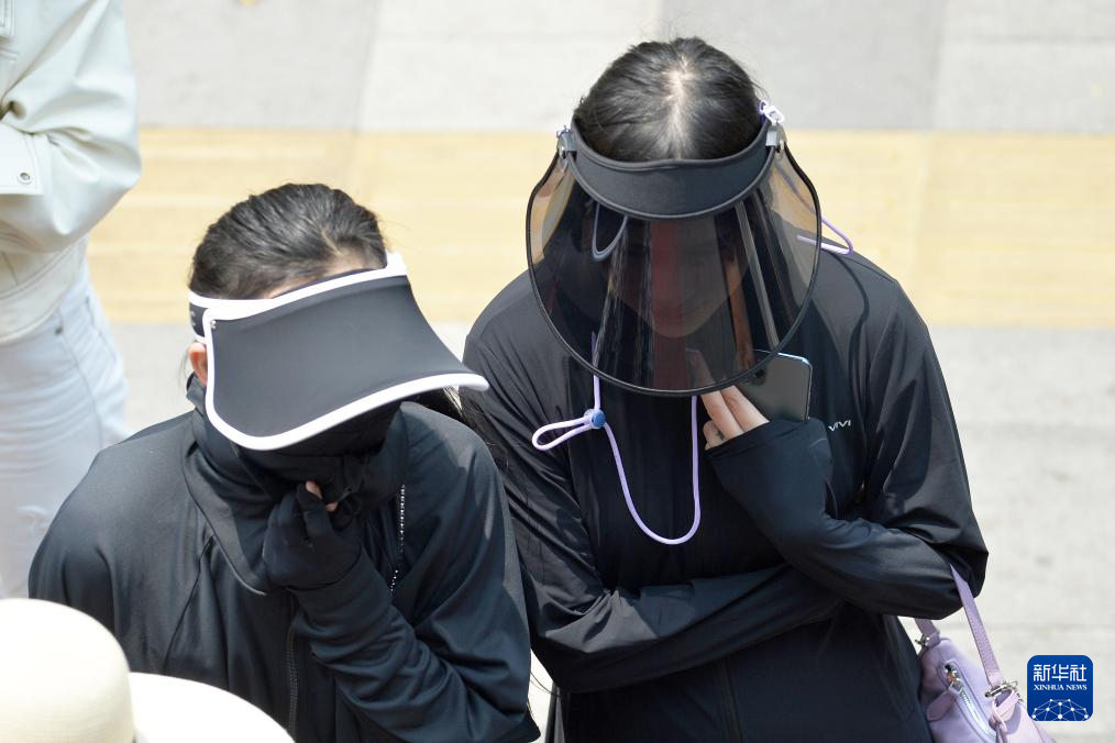 4月3日,行人在泰国曼谷街头用手遮阳。