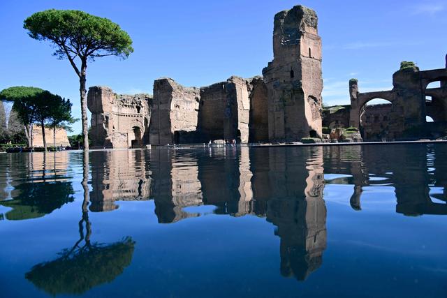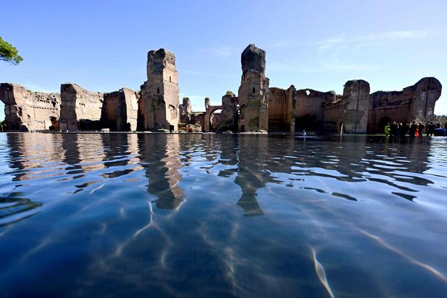 4月4日,参观者在意大利罗马卡拉卡拉浴场新搭建的人工水景前游览。新华社/法新