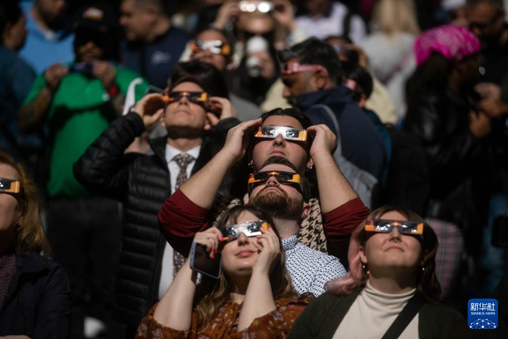 4月8日,人们在美国纽约时报广场附近观看日食。