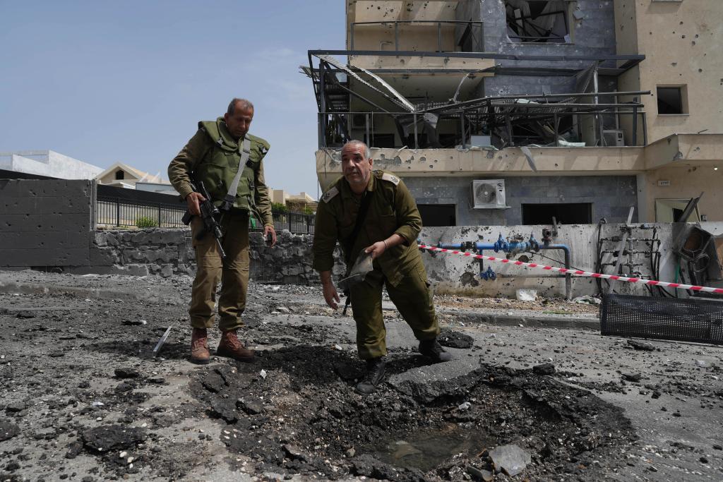 3月27日,以色列安全人员在以色列北部城市谢莫纳检查一处遭火箭弹袭击的建筑。新华社发(阿亚尔·马戈林摄/基尼图片社)