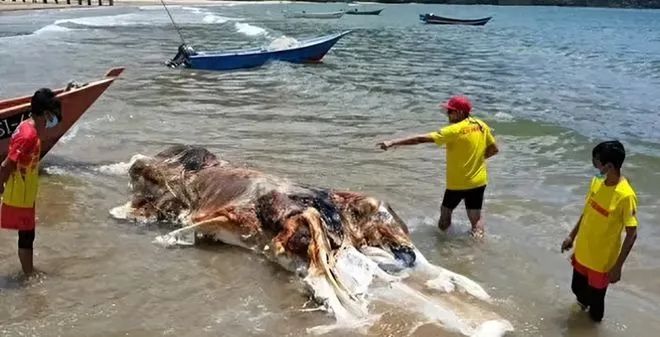 大型海洋生物死后,其尸体可能会漂浮到岸边,并因高度腐烂而难以凭借外观辨认。经过专家的初步分析,该不明生物被认为可能是某种大型海洋生物的腐肉。这一结论基于该物体外表类似腐肉或内脏及散发的恶心气味而得出。