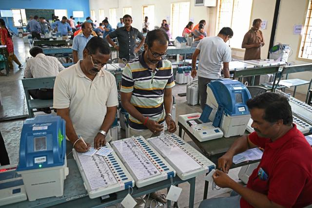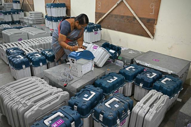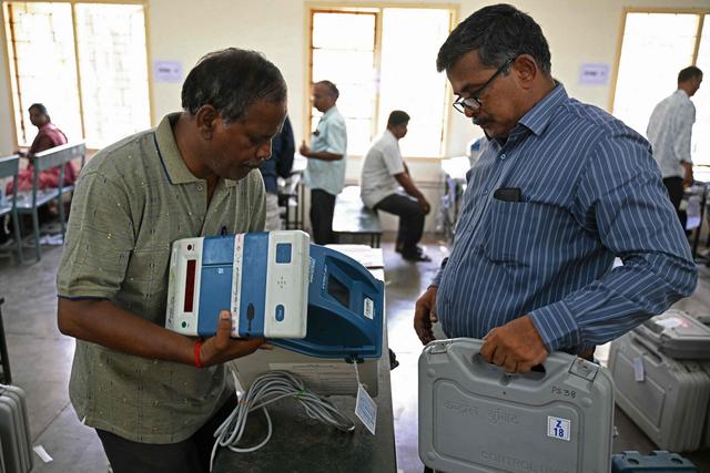 4月11日,在印度哥印拜陀,工作人员在一处投票站整理调试投票设备。新华社/法新