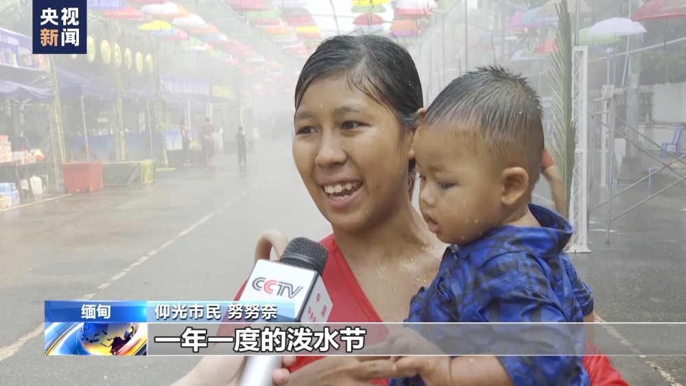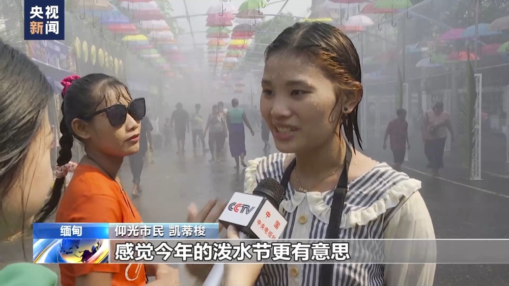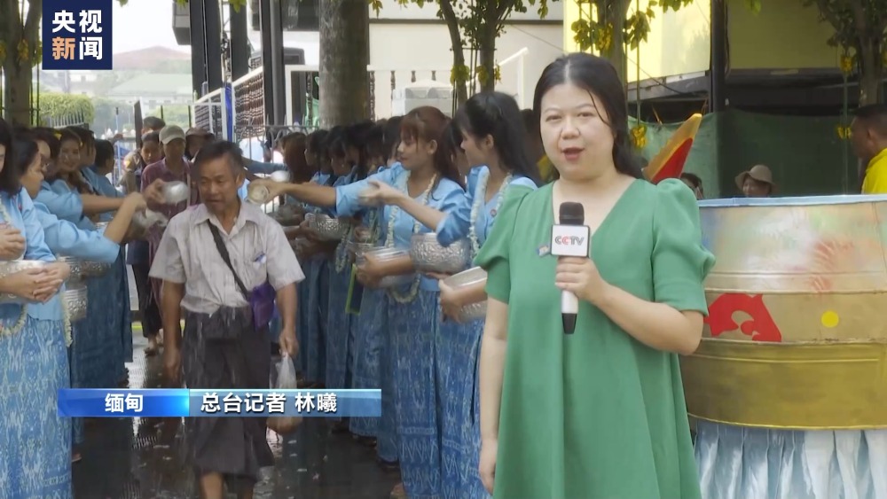 总台记者林曦:在泼水节这一天,当地女子还会穿上漂亮的传统服饰,用装满水的银器舀水泼向人群以示尊敬和祝福。