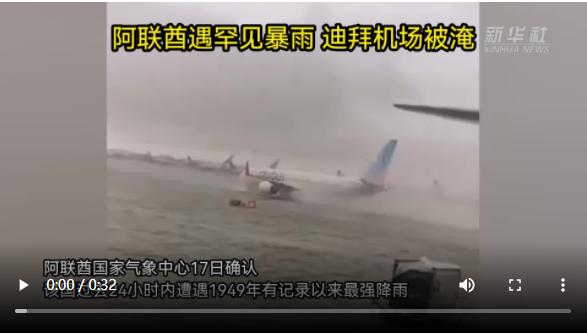在迪拜,这一天的降雨量相当于当地平均一年半到两年的雨量,导致迪拜国际机场停机坪被淹,暂停航班降落两个多小时。