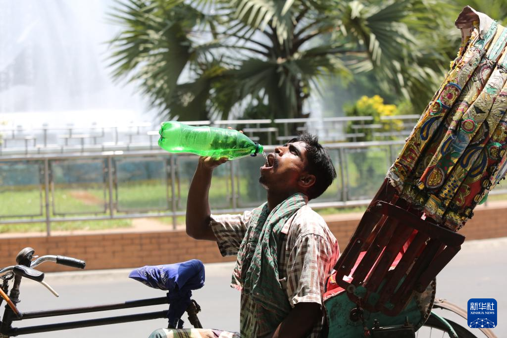 4月20日,在孟加拉国首都达卡,一位人力车夫喝水解暑。