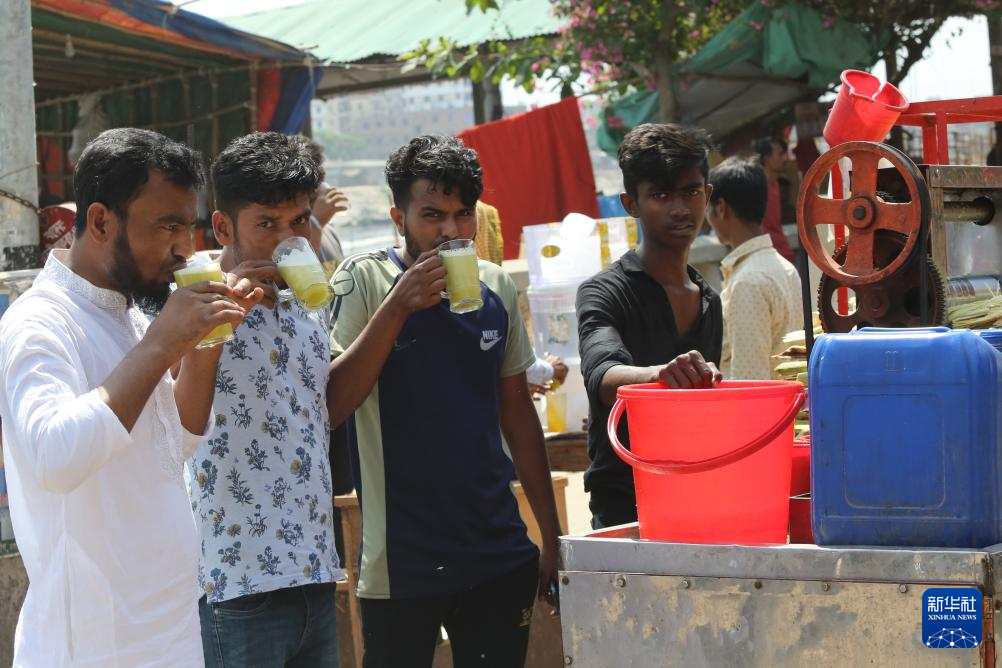 4月20日,在孟加拉国首都达卡,当地居民饮用甘蔗汁解暑。