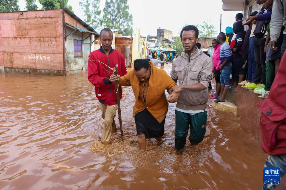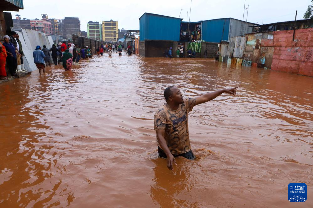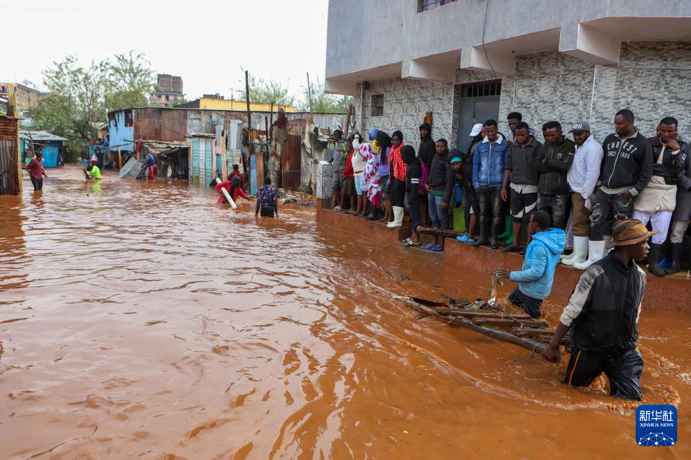 4月24日,在肯尼亚内罗毕马萨雷贫民区,人们被洪水围困。