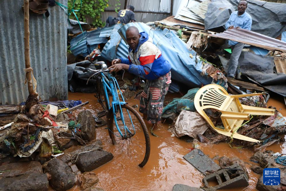 4月24日,在肯尼亚内罗毕马萨雷贫民区,人们查看因洪水受损的房屋。