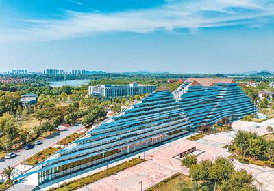 湖北武汉西南部,马鞍山与后官湖的绿水青山之间,坐落着一栋整体造型宛如山丘的银白色建筑。层叠有致的玻璃幕墙,仿佛波浪般连绵起伏,与周围山水风光融为一体。