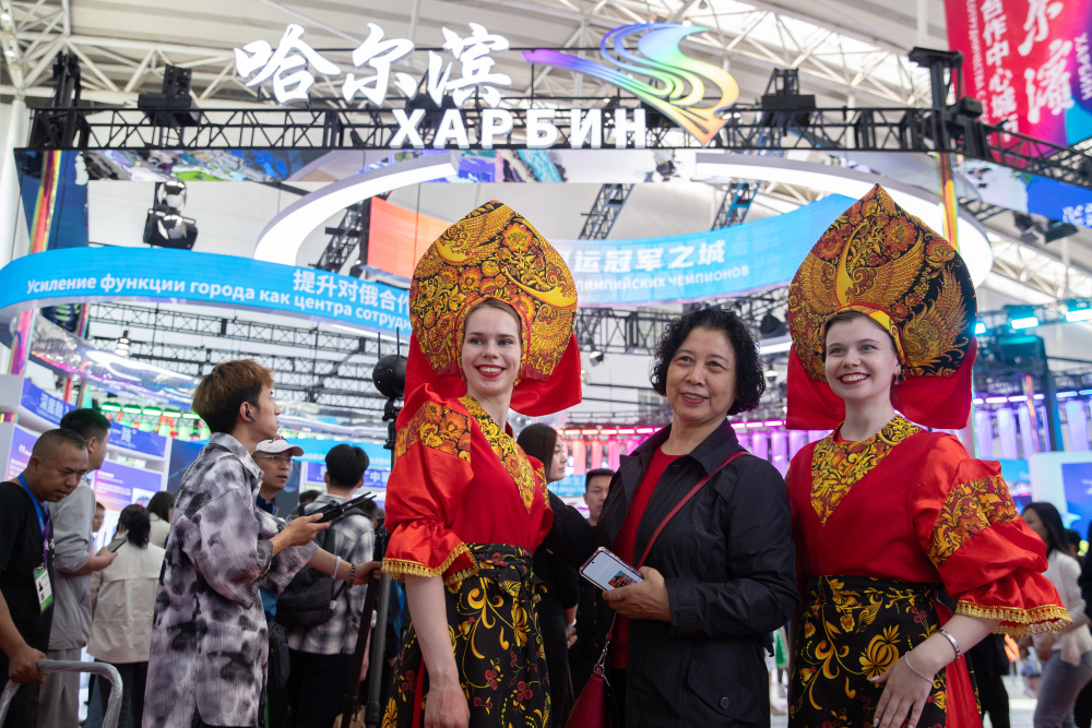 5月18日,在第八届中俄博览会现场,参会者与俄罗斯演员合影。新华社记者 张涛 摄