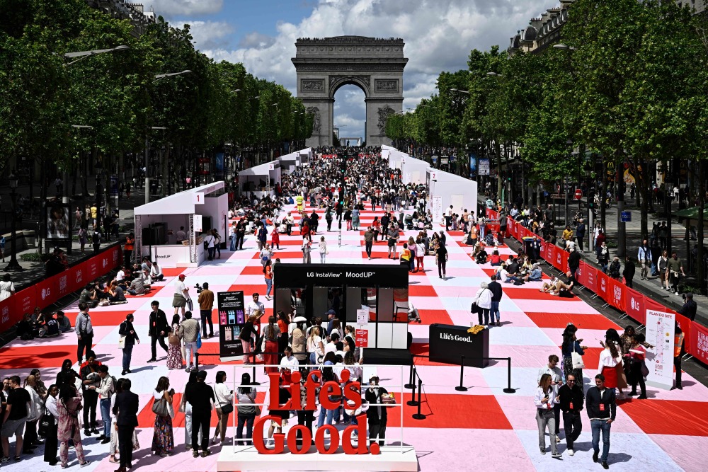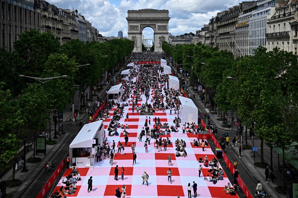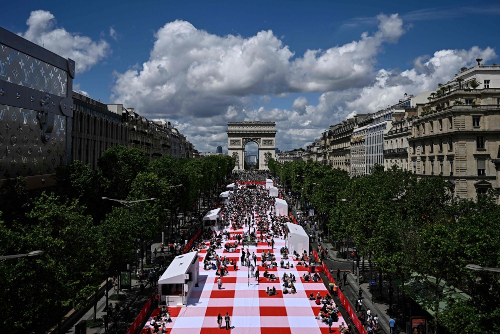 据外媒报道,香榭丽舍大街近日铺上了一条216米长的巨型野餐布,大约4000人参加了这场大型户外野餐活动。