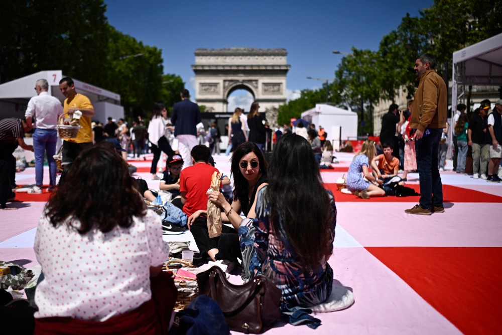 5月26日,在法国巴黎香榭丽舍大街,人们参加户外野餐会。新华社/法新