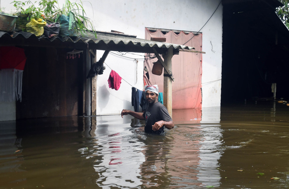 6月3日,在斯里兰卡科伦坡,一名男子经过被洪水淹没的街道。新华社发(阿吉特·佩雷拉摄)