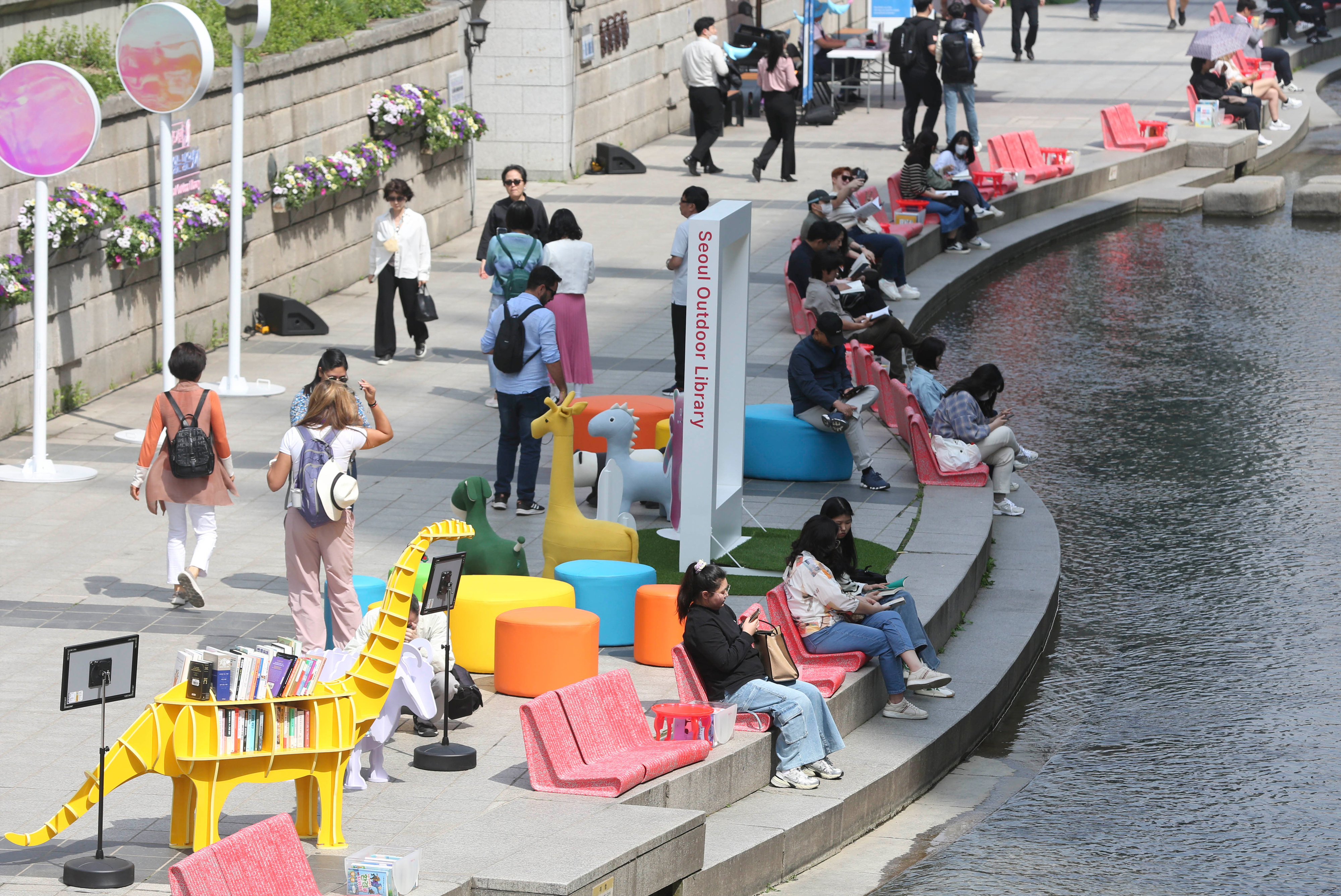 4月19日,人们在韩国首尔市的清溪川边的露天图书馆读书、休闲。新华社记者姚琪琳摄