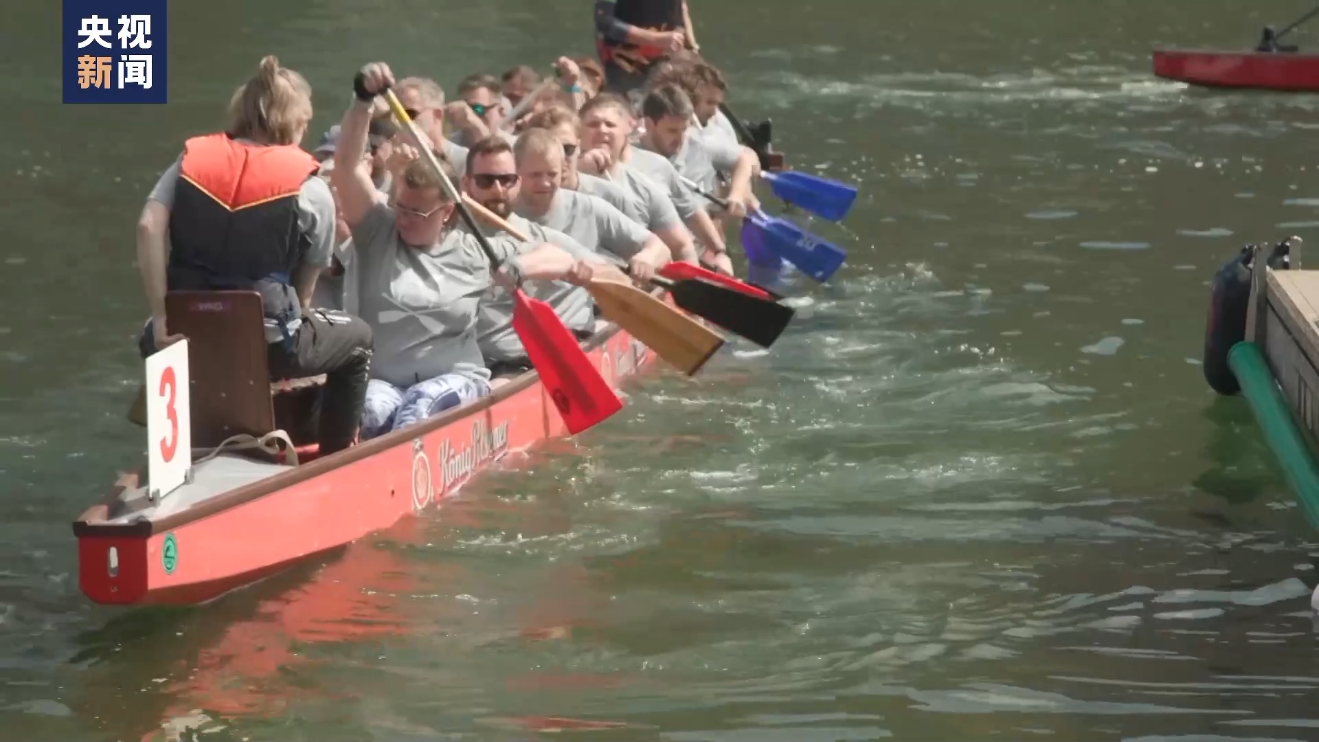 近日,奋楫争先的赛龙舟赛到了德国,在端午节来临之际,德国杜伊斯堡举行了一场别开生面的龙舟赛,有140支队伍参加。来看总台记者从现场发回的报道。