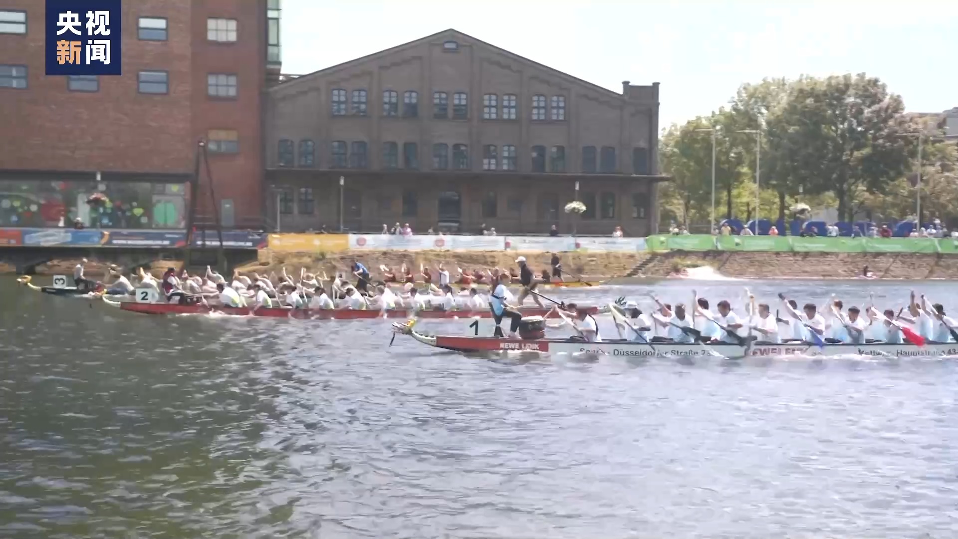 总台记者余鹏:现在在我身后的,是德国杜伊斯堡趣味龙舟赛。龙舟上传来鼓声阵阵,运动员们飞桨逐浪、奋勇争先。岸边围满了加油助威的观众,人们尽情享受比赛带来的激情,这场龙舟赛也变成了老少皆宜的聚会。