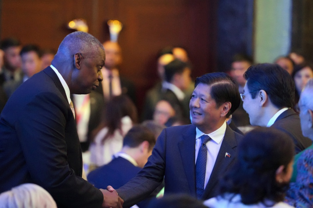 2024年5月31日,第21届香格里拉对话会上,菲律宾总统马科斯(右)与美国国防部长劳埃德·奥斯汀(左)握手。